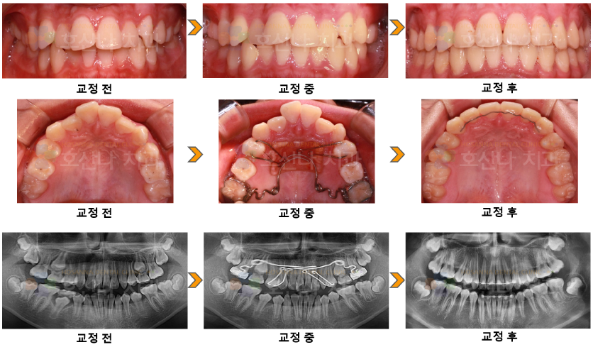 상악전치는 상당한 돌출이 있지만 안모는 양호 하여 발치 없이 펜듈럼으로 교정을 진행하였습니다.
