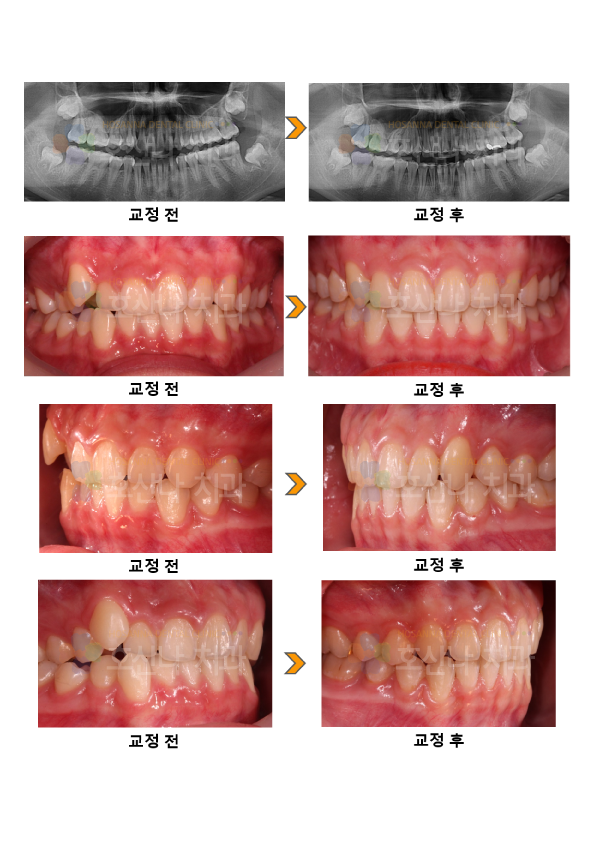 부모님도 최대한 발치 하지 않길 원하셔서 비발치 확장을 계획 후 RPE 와 BH 를 통해 확장하였고 damon 브라켓을 사용하였으며 1년이 안 되는 단기간에 마무리 되었습니다.